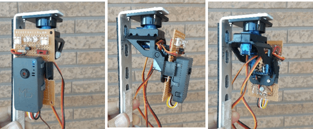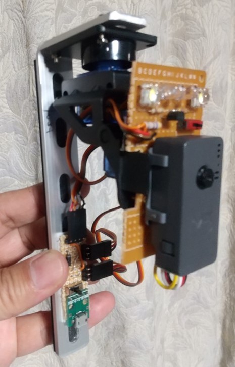 モバイルバッテリーから電源スイッチを介して、サーボモーター、Timer Camera X、LEDに5Vを供給します。LEDは別途ON/OFFスイッチをつけてます。サーボモーターはTimer Camera XのGROVE端子の2つのGPIOで制御します。ホントはLEDのON/OFFもTimer Camera Xから制御したかったんですが、GPIO端子が足りないので諦めです。
