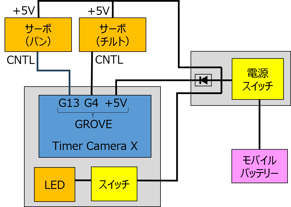 Timer Camera X1はGPIOがGroveポートの2本しかありませんので、この2本で2台のサーボ(パン、チルト)を制御します。サーボドライバなどは使わずに、ライブラリーESP32Servo.hを使って直接PWMで制御しています。構造の詳細はこんな感じです。