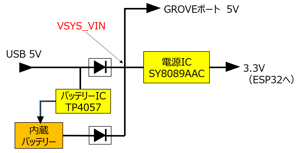 GROVE端子の5VにはUSBの5Vから逆流防止用のダイオードを介して直結されてます(うわさはなんやったんや???)。内部での端子名はVSYS_VIN。で、そこに電源ICもつながっており、ESP32用の3.3Vを生成しています。ということは、GROVE端子に5Vを与えればTimer Camera Xは動作しそうです(バッテリーに充電はできないけど)。実際には↑の回路図に示すように、モバイルバッテリーから逆流防止用のダイオードを介してGROVE端子に5Vを供給しました。これでばっちりや!!