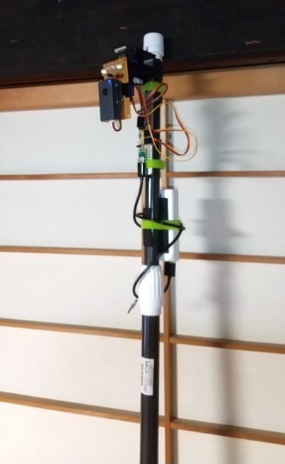 ホームセンターで売ってるアルミのL字型の金具にサーボと電源受けを取り付け、それを伸縮棒にマジックテープで取り付けました。