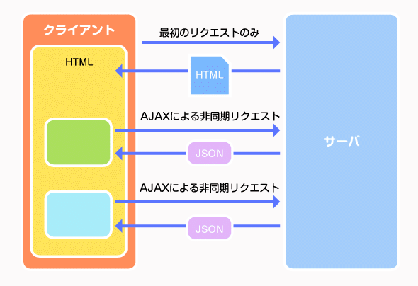 クライアントのリクエストに対してからのHTMLとJSを返し、クライアント側でJSを実行しレンダリング、及びデータ取得を行いっています。
