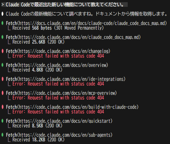 ただ、ドキュメントマップを参照した後、手当たり次第にWebFetchしてそうなので、時間がかかりはします。