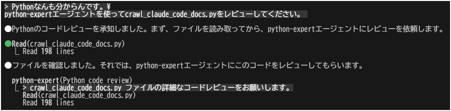 python-expertエージェントがちゃんと動いてくれているのがわかります。