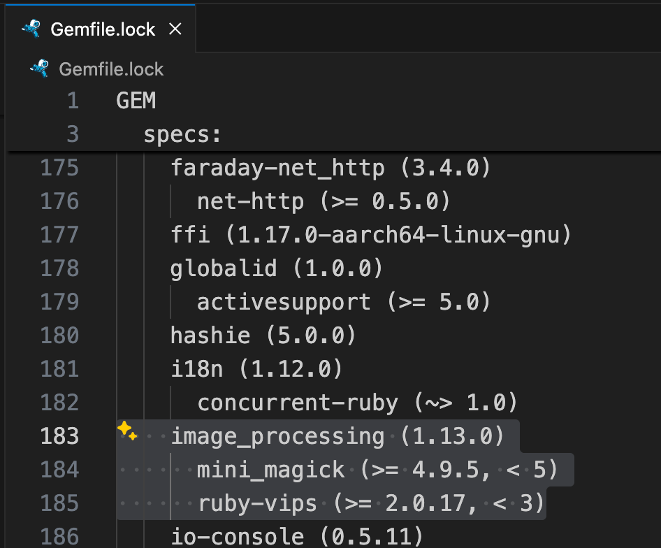 ちなみにimage_processingをインストールするとmini_magickもインストールされています(gemfile lockを確認)