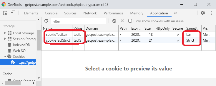 2つのCookieがセットされており、cookieTestLaxはSameSite属性の値がLaxに、cookieTestStrictはStrictに、名前の通り設定されていることが分かると思います。この状態で、サードパーティとなるドメインのHTMLファイルからWebサーバへリクエストを送信してみましょう。