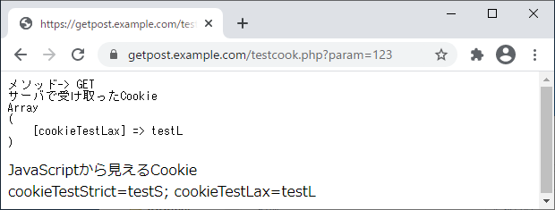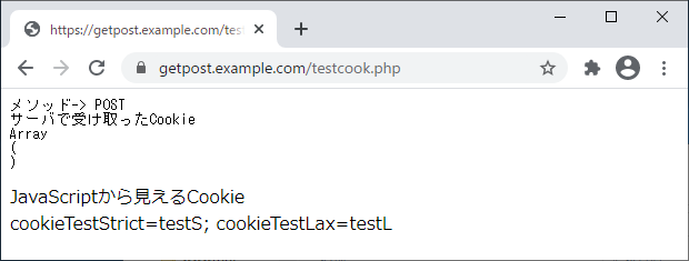 ちなみにSameSite属性によって送られなかったCookieは「送られなかった」だけであり、JavaScriptからは(HttpOnly属性が無ければ)普通にアクセスできます。シンプルに見たいのでPHPで作ったページのHTML部分にScriptタグを追加します。