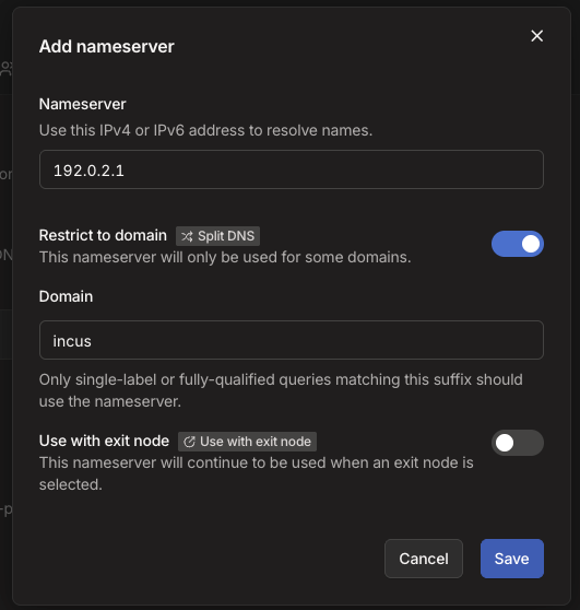 NameserverのIPアドレスは、8-2で確認した末尾が1のもの = incus network listコマンドの出力結果からサブネットマスクを除いたものを入力します。