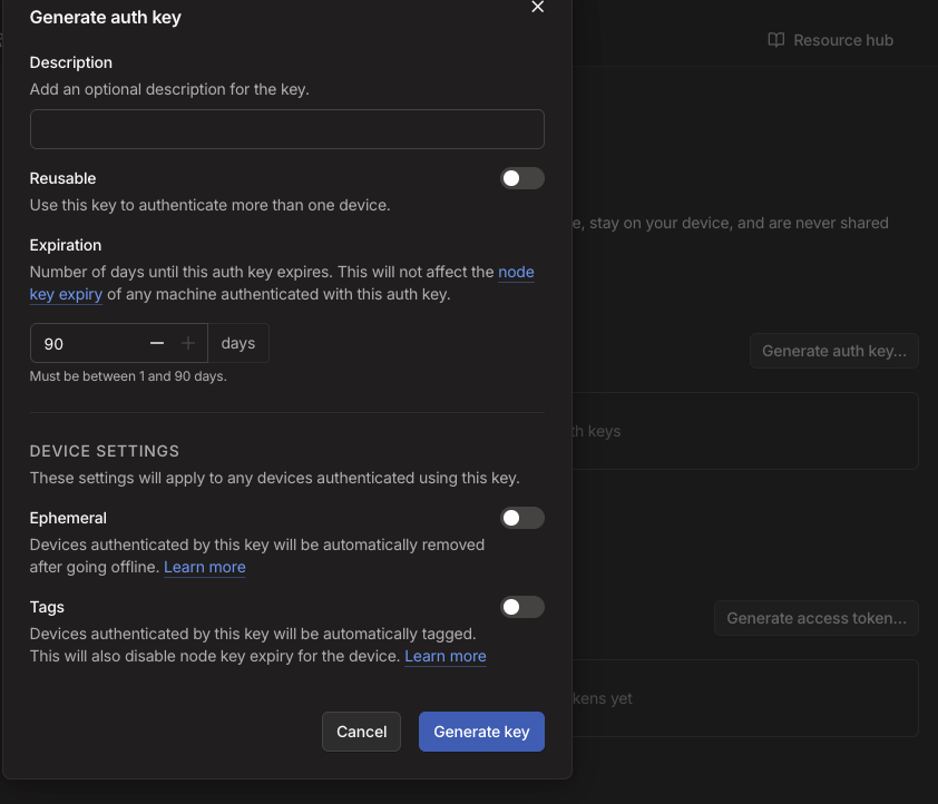 まず、IncusOSに設定するAuth keyを、Tailscaleのコンソールから作成します。