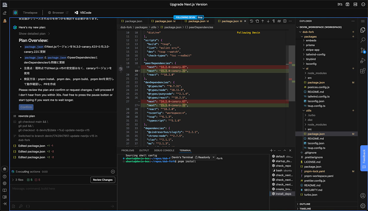 これまで、タイムラインやチャット部分はDevin独自のUIで、Devinの様子をVS Code上で確認できるUIでした。今回のアップデートで、全てがVS Code上で提供されるようになりました。(タイムラインやチャット部分は、VS Codeの拡張機能として提供されていそうです。)