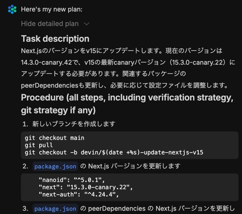 これまでは、Devinに指示を行うとすぐに作業が開始されてしまうので、プランニングを行ってもらうには明示的に指示する必要がありました。今回のアップデートで、デフォルトでプランニングが行われ、事前に作業内容を確認できるようにりました。