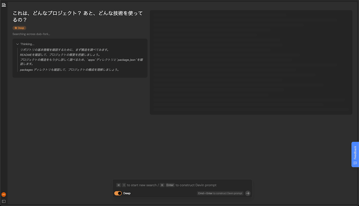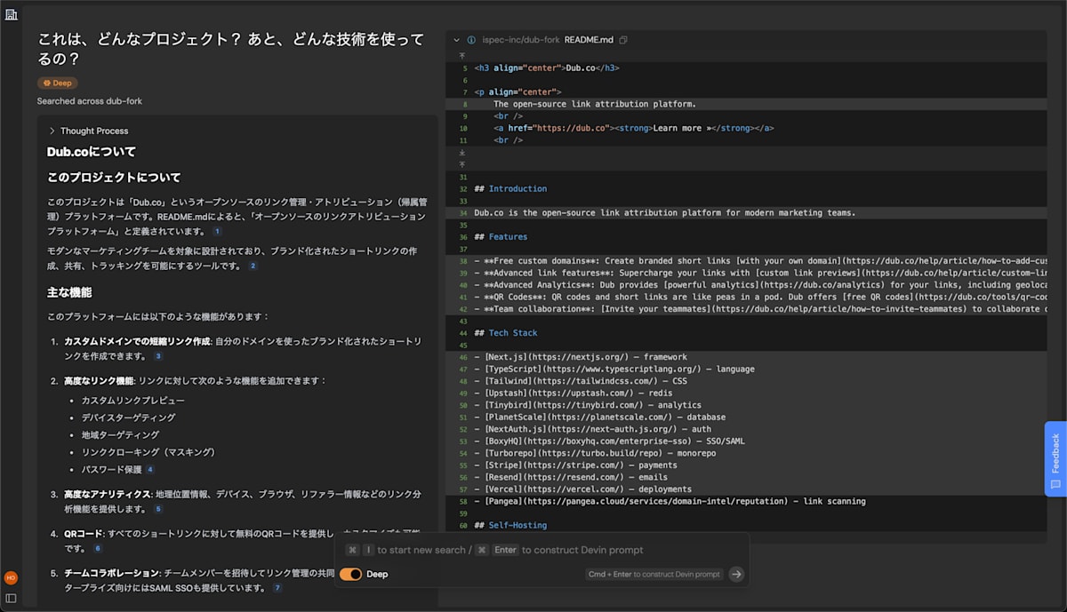Devin Searchは、コードの変更を伴わない調査や質問に特化した新機能です。これまでDevinを使用して情報収集や調査を行う際には、「コードの変更をしないで」と毎回明示的に指示する必要がありました。この新機能により、そのような指示が不要となり、より自然な対話形式で技術的な質問や調査が可能になりました。