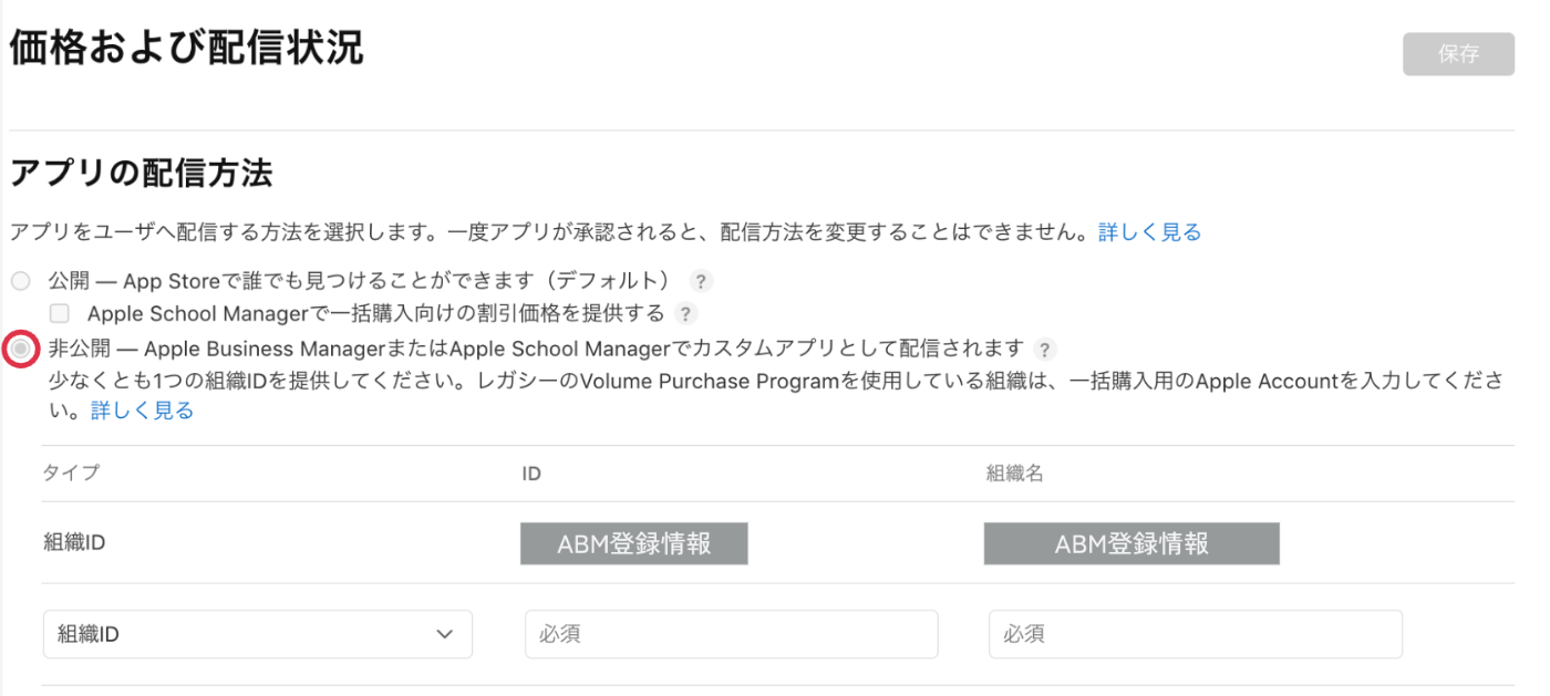 通常のAppStore公開アプリ配布の手順を進め、AppStoreConnect上で初回リリース前にカスタムアプリ用の設定を行います。アプリの配信方法にて、非公開にチェックをいれてABMの情報を紐付けておきます。なお、今回は計2回審査を行い、どちらもほぼ1日で終わりました。審査時間(というかアプリの扱い自体)はAppStore公開アプリと大して変わらないようです。