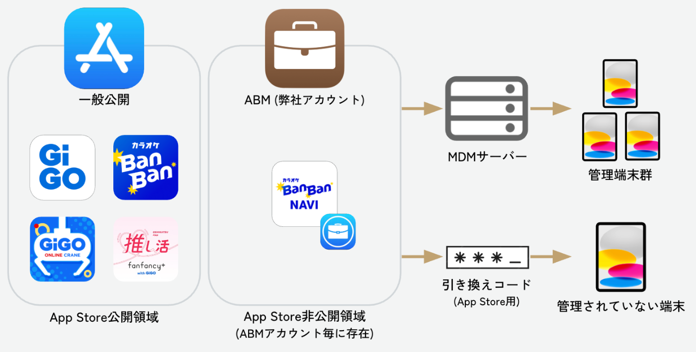 GENDAのグループではカラオケBanBanという店舗を400店舗弱運営しており、今夏に店舗業務を効率化するためのDXアプリをiPad向けに開発することになりました。まずはiOSアプリの配布方法を検討することになり、以下の制約があることを整理しました。
