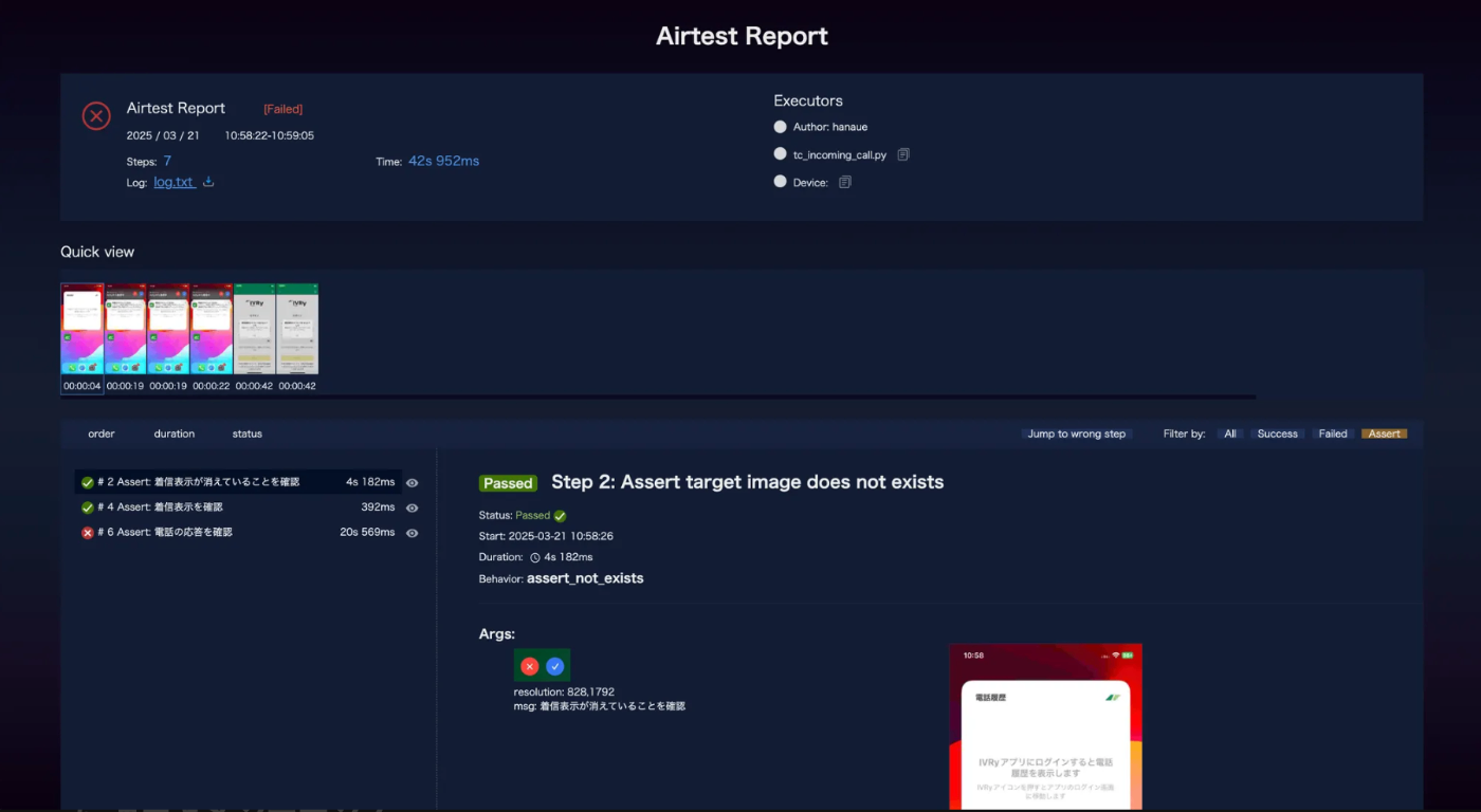 Airtest は、アプリ内だけでなく OS が表示する通話 UI までも画像として検出・操作できるため、通話機能を含む IVRy のモバイルアプリ特有の制約を避けてテストを行うことができました。