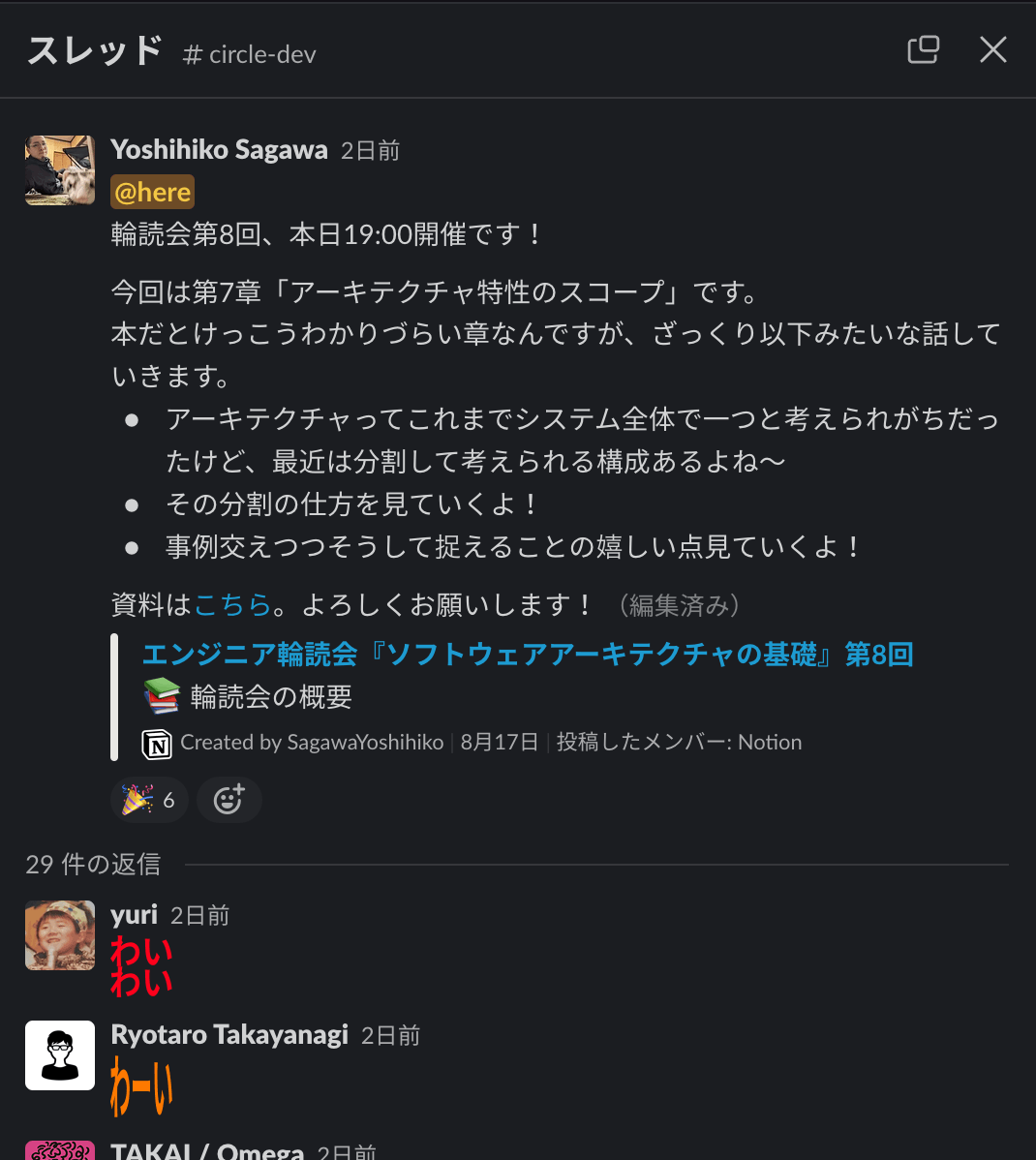 Slackにて輪読会スレッドも毎回立てて自由に発言する運用としており、ここのコメントを拾っていくだけでも盛り上がります。