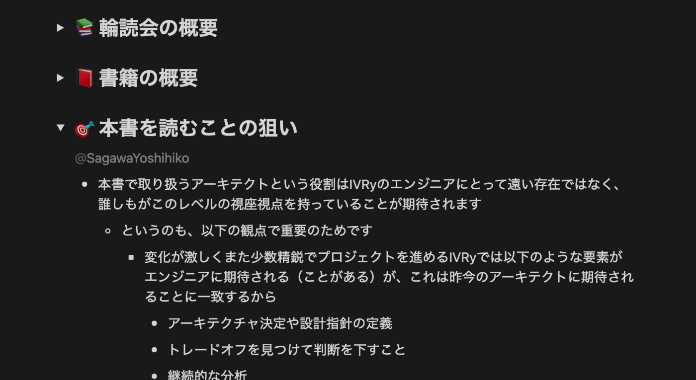 輪読会を担当した場合、書籍をただ読むだけでなく、メンバーに伝わるようにドキュメントに起こし、説明する必要があります。読む工程に加え、この書き起こす工程と人に説明する工程を踏むことになるので、書籍内容の理解度・頭への定着度はただ読むことに比べて爆上がりするんですね。しかも当日にはメンバーからのコメントや質疑・議論が加わるので、さらに効果があります。輪読会の醍醐味と言えるかもしれません。