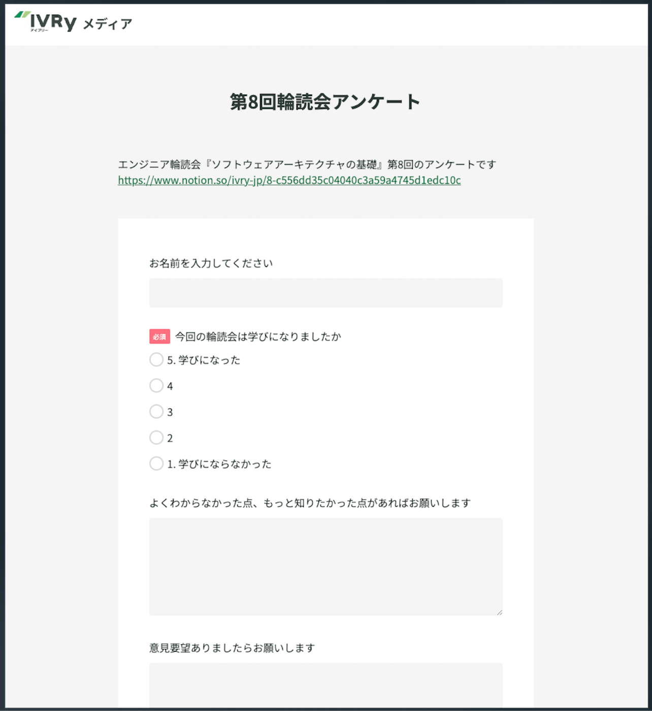 参加メンバーが所感や意見・要望をフィードバックできる場としてアンケートを用意しておくと、参加者側は自分事として捉えやすいですし、主催者側は輪読会の定量評価にも使えます。イテレーティブに改善し続けるための材料になるのでとてもおすすめです。