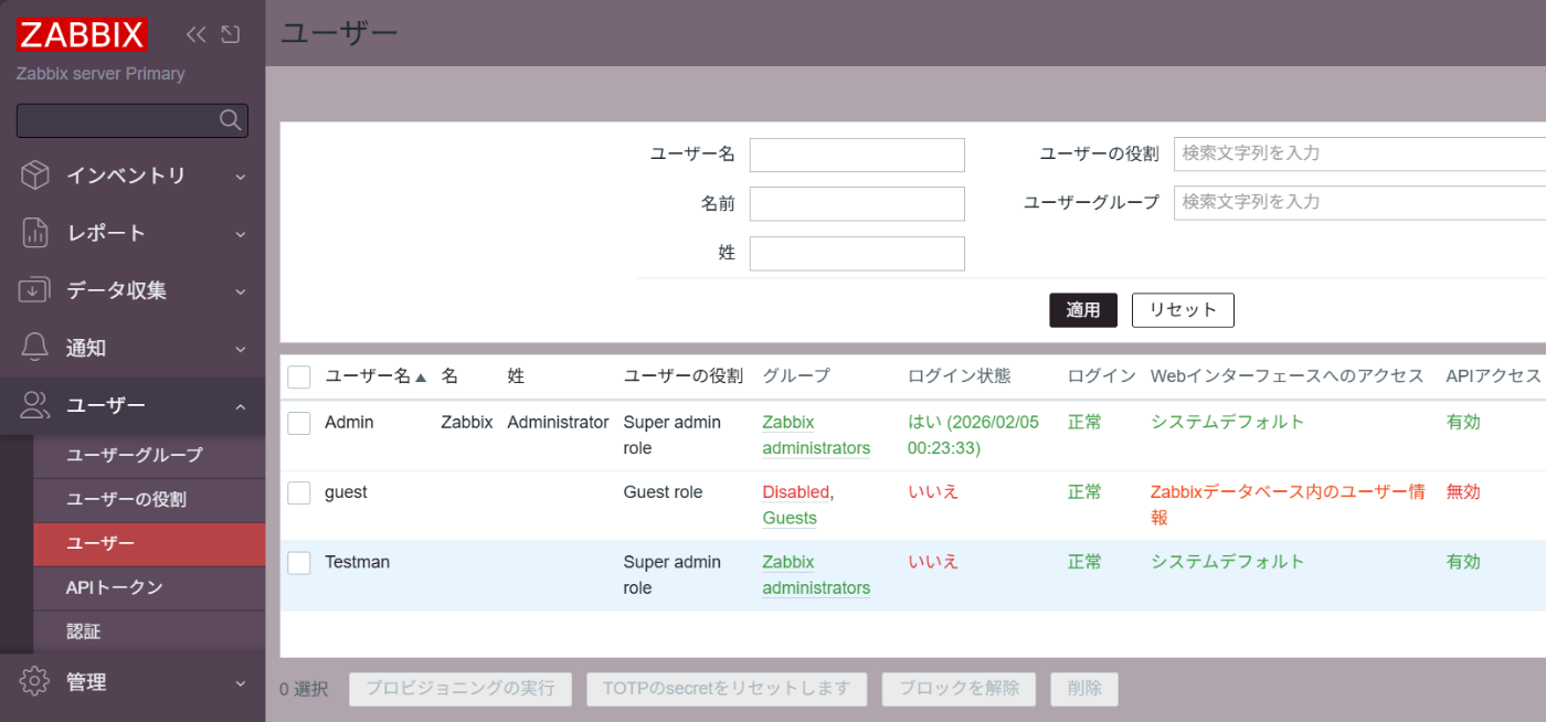 https://www.zabbix.com/documentation/7.0/jp/manual/api/reference/user/create# 特権管理者で"Zabbix administrators"グループに所属するTestmanユーザーを作成する curl -sS \ --request POST \ --url 'http://127.0.0.1/zabbix/api_jsonrpc.php' \ --header 'Authorization: Bearer 0424bd59b807674191e7d77572075f33' \ --header 'Content-Type: application/json-rpc' \ --data ' { "jsonrpc": "2.0", "method": "user.create", "params": { "username": "Testman", "passwd": "Usertest123", "roleid": "3", "usrgrps": [ { "usrgrpid": "7" } ] }, "id": 1 }' \ | jq -r 'if .error then .error else .result end'レスポンス