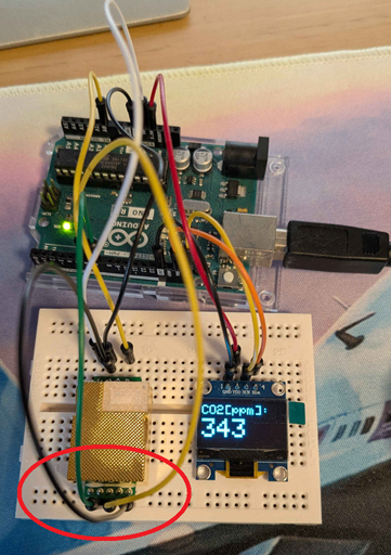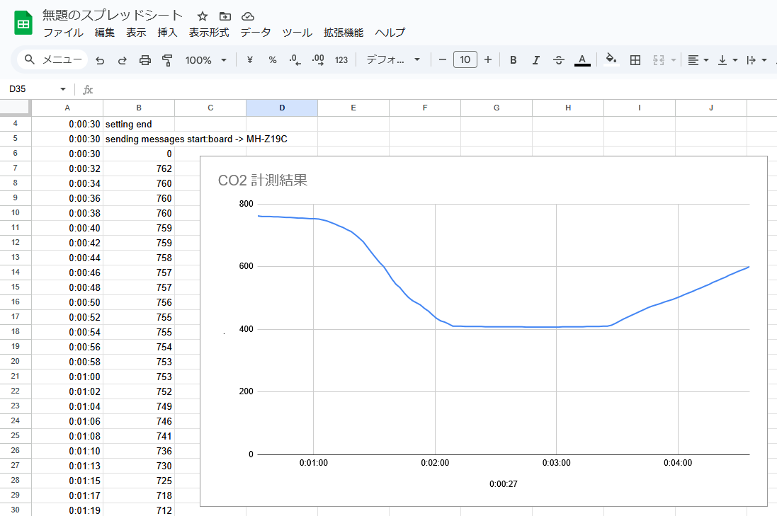 - 詳細:計測を開始し、屋内 → 屋外 → 屋内へ移動させた結果、屋外では 400ppm となっており、意図通りに数値が変動している(400ppm → 外気環境は一般的に400ppmとされている)