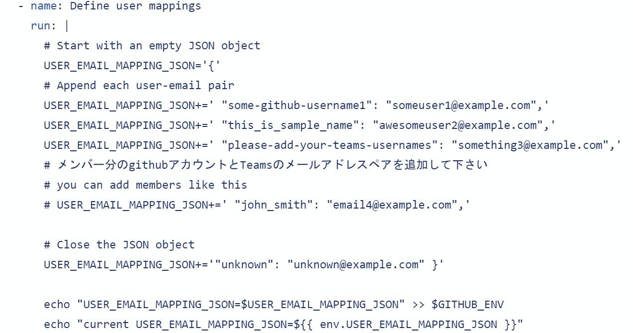 単一のymlファイルにGithubのアカウント名とTeamsアカウントのメールアドレス をペアでベタ書きする、というやや素朴な作り方をしているのは、特に導入の閾値を下げたいという意図があったためです。