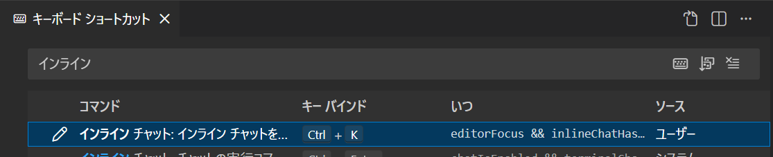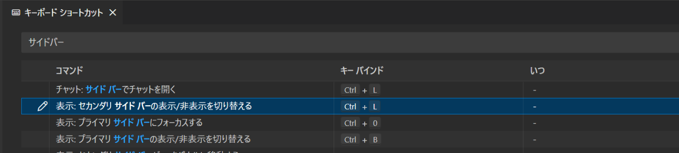 👌VSCodeでCursorのようにCtrl+L(Ctrl+K)でチャット開閉する方法2025/11/14に公開VS CodeショートカットCopilotCursorキーバインドtech 概要 普段はCursorだが、VSCode(Github Copilot)で開発することも増えた。 ショートカットが違うのが嫌なので設定を変更する。 サイドバー設定 左上のファイルから ファイル⇒ユーザー設定⇒キーボードショートカット を選択 サイドバーで検索し、 「表示:セカンダリ サイドバーの表示/非表示を切り替える」 でCtrl+Lを設定 インライン設定 インラインで検索し 「インライン チャット:インラインチャットを開く」 でCtrl+Kを設定 Discussion