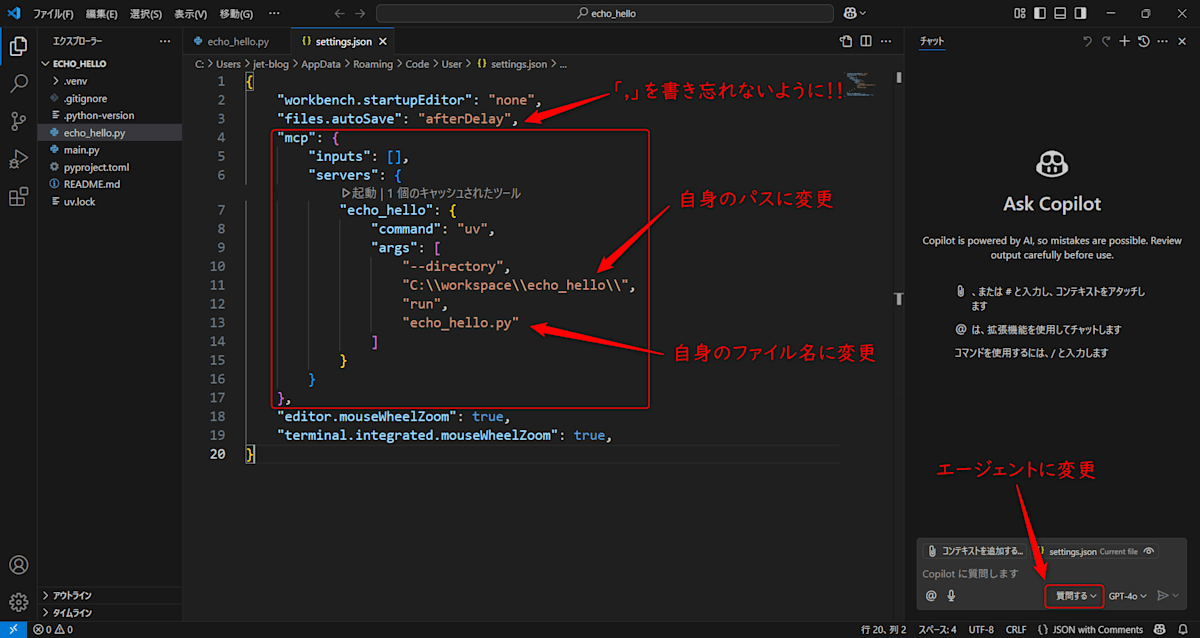 GitHub Copilotのチャット欄にecho_hello 山田太郎