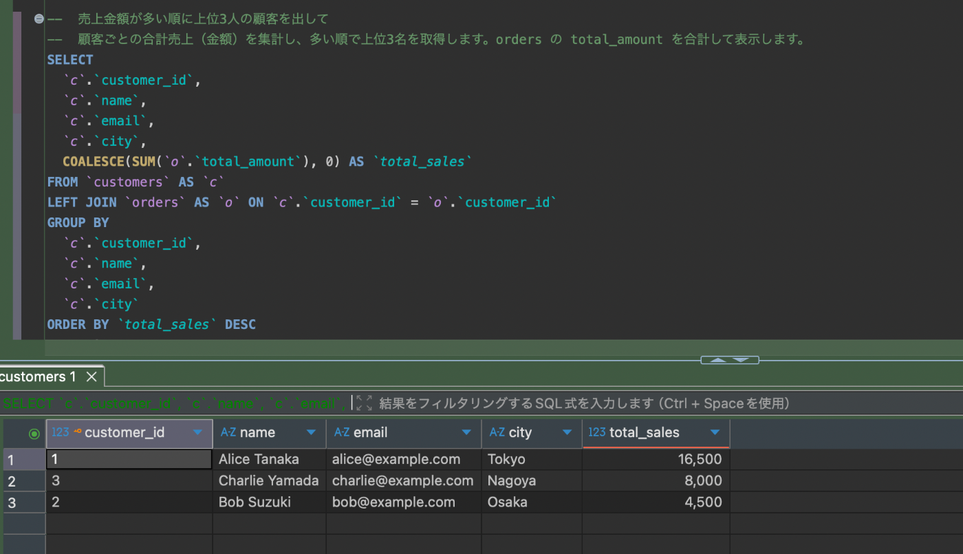 -- 顧客ごとの合計売上(金額)を集計し、多い順で上位3名を取得します。orders の total_amount を合計して表示します。