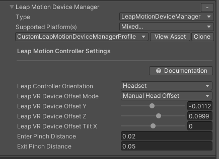 「Leap VR Device Offset Mode」を「Manual Head Offset」に変更する。