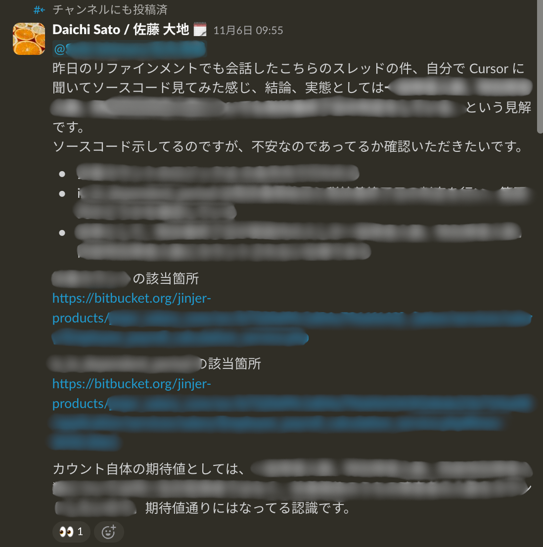 Cursor を使用すると、実際にソースコードを書いていなくても、「年末調整の扶養家族の判定ロジックはこのファイルに書いてあります」と教えてくれるので、開発チームと仕様を議論する際、具体的なコードを参照しながら会話ができます。