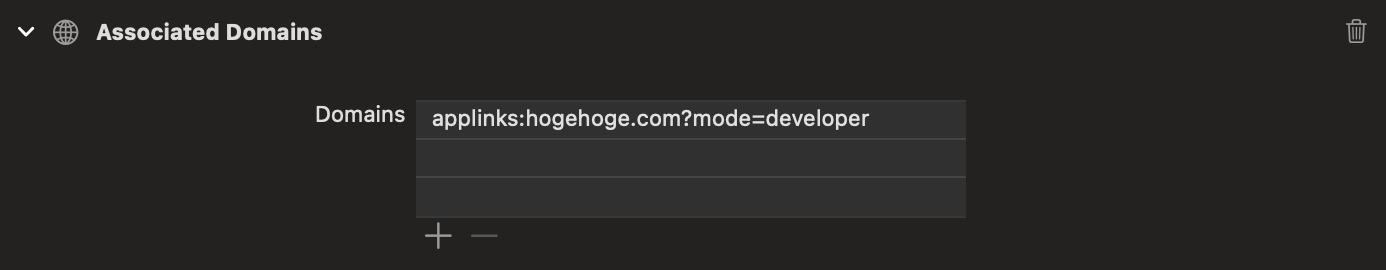 <dict> <key>com.apple.developer.associated-domains</key> <array> <string>applinks:hogehoge.com?mode=developer</string> </array> </dict>