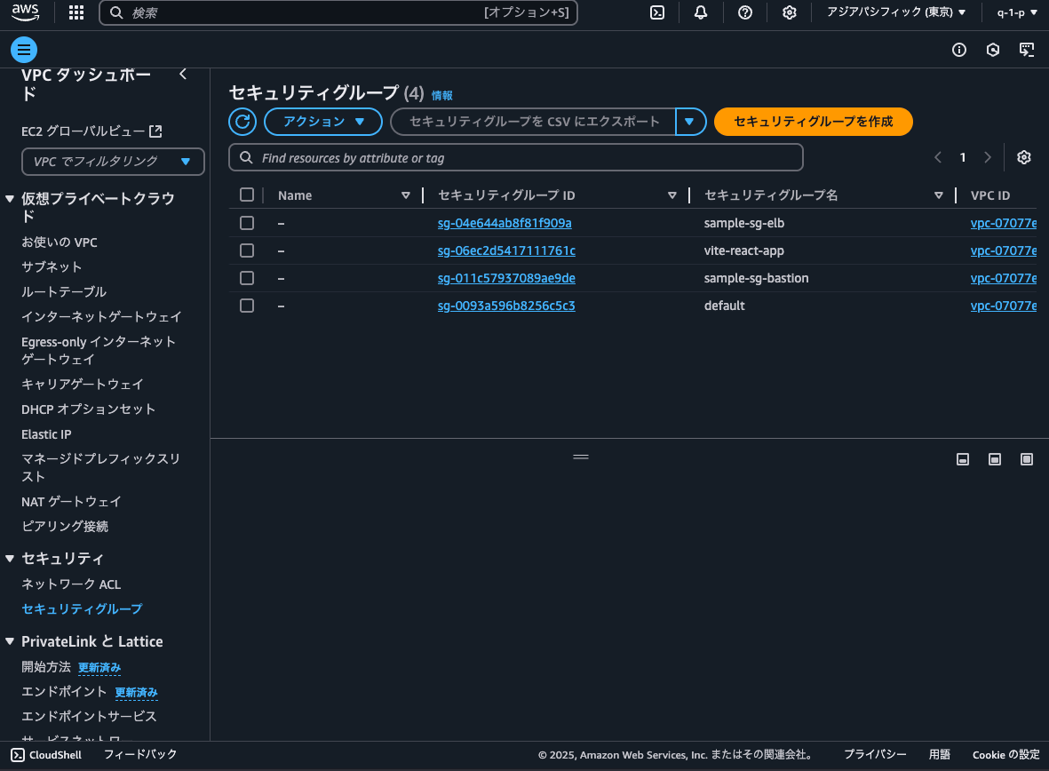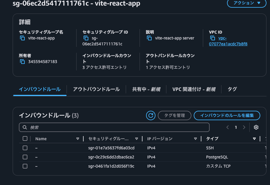 - 前回作成したセキュリティグループ(vite-react-app)のセキュリティグループIDをクリックし、設定ページに移動します