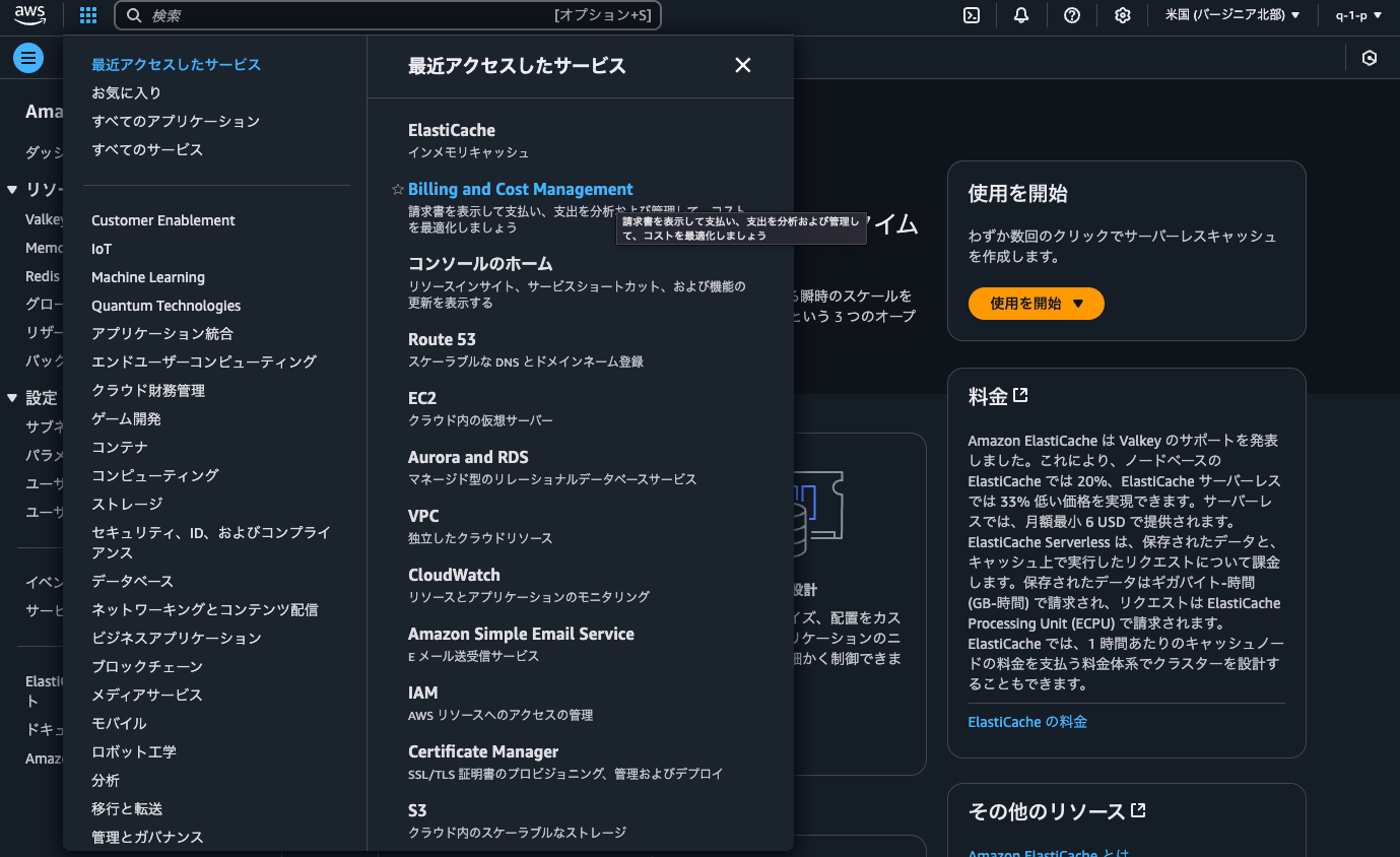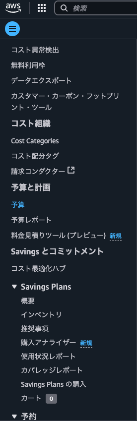 - AWSコンソール左上のルービックキューブのようなマークから、「Billing and Cost Management」ページへ移動する