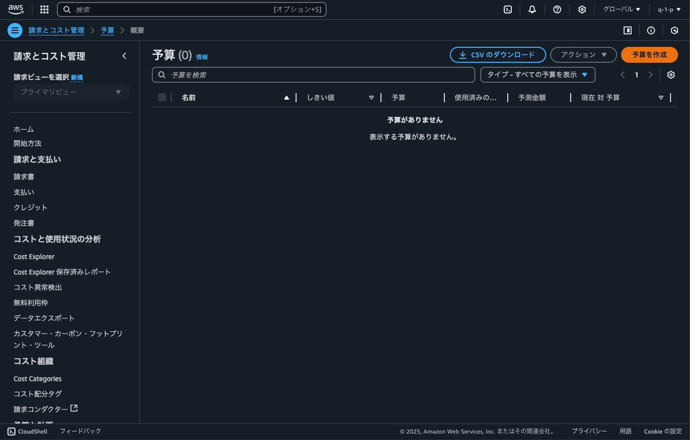 - ページ左側のタブから「予算」をクリックし、「AWS Budgets」ページへ移動する