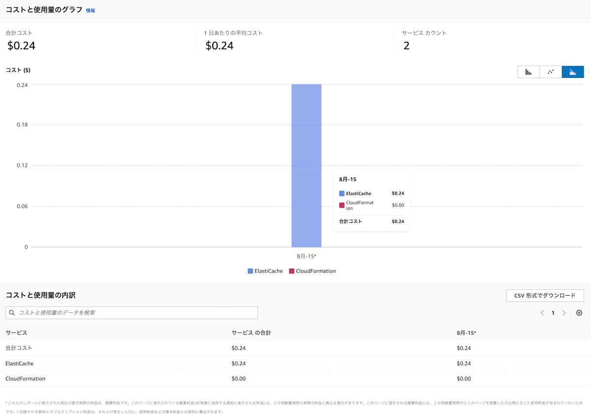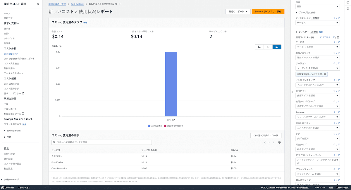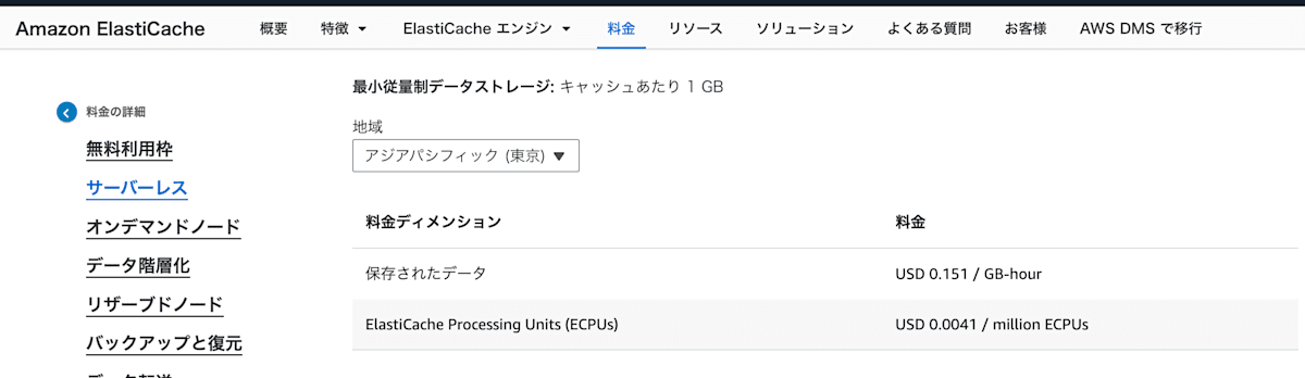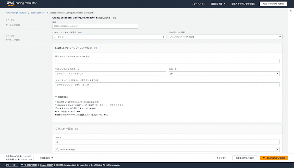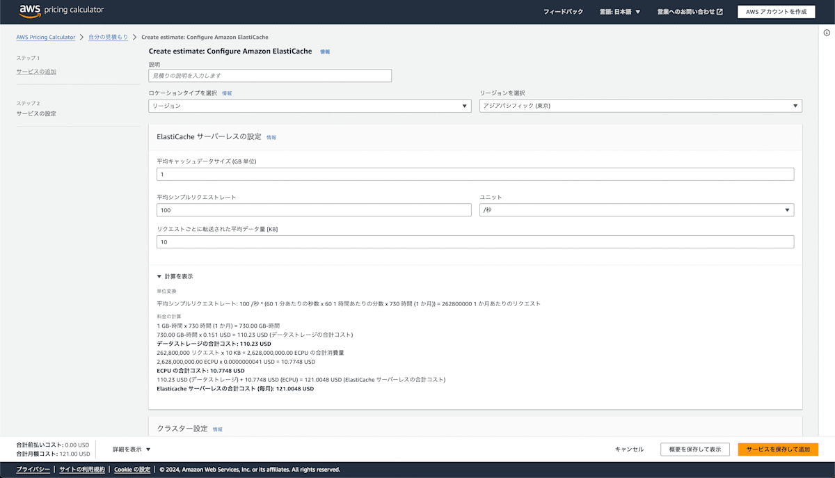 110.23 USD (データストレージ) + 10.7748 USD (ECPU) = 121.0048 USD (ElastiCache サーバーレスの合計コスト)