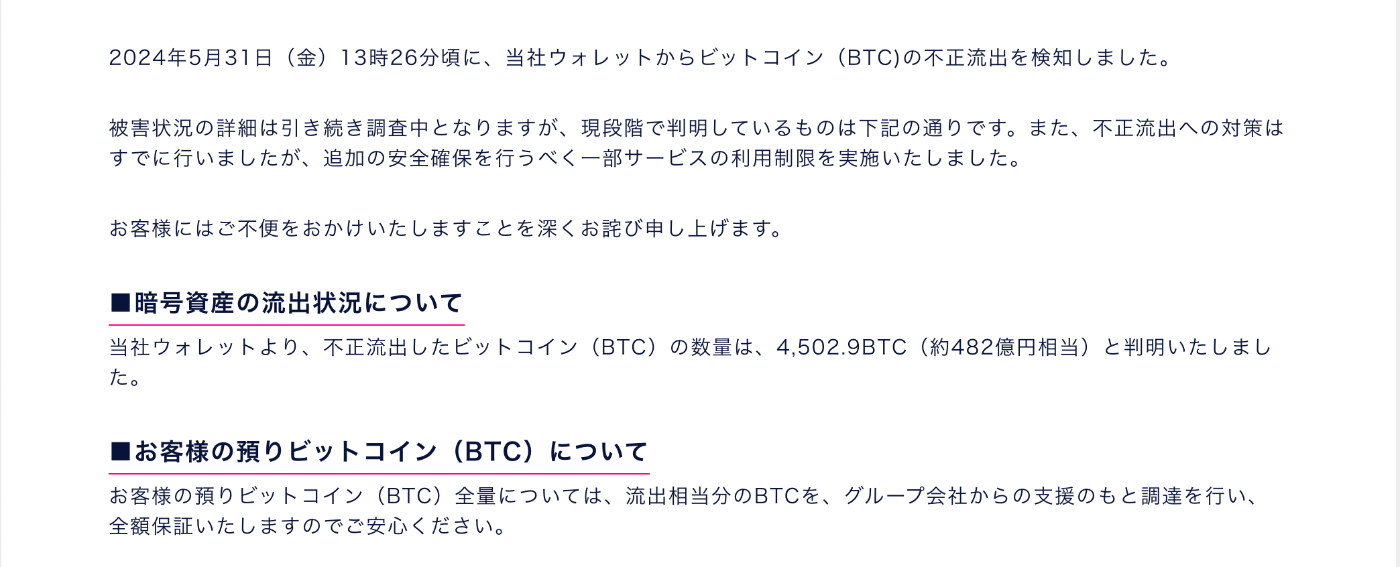 2024年5月31日に何者かにより、480億円相当のビットコインが第三者のウォレットに不正に流出しました。