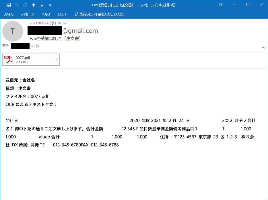 - メールには送信元、ドキュメントの種類、OCRで抽出したテキスト情報を載せる