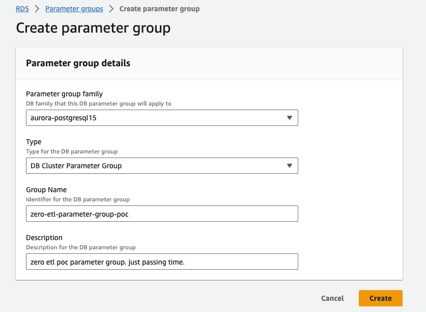 パラメータグループを作成してから、クラスターを作成しましょう。