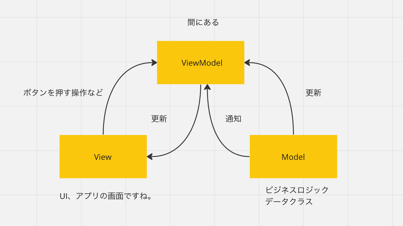 ModelとViewの間にあって仲介をしてくれるものです。Controllerと似てる気がしますが、違ったりします。僕の知ってるViewModelだと、ロジックはViewModelのクラスには書いてなくて、Repositoryと呼ばれるクラスにロジックは書いて、UIで、ボタンを押すなどの操作が実行されたら、ViewModelを使って、メソッドを呼び出します。