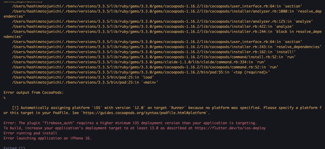 [プラットフォームが指定されていないため、ターゲット `Runner` にバージョン `12.0` のプラットフォーム `iOS` を自動的に割り当てます。Podfileでプラットフォームを指定してください。https://guides.cocoapods.org/syntax/podfile.html#platform`を参照してください。