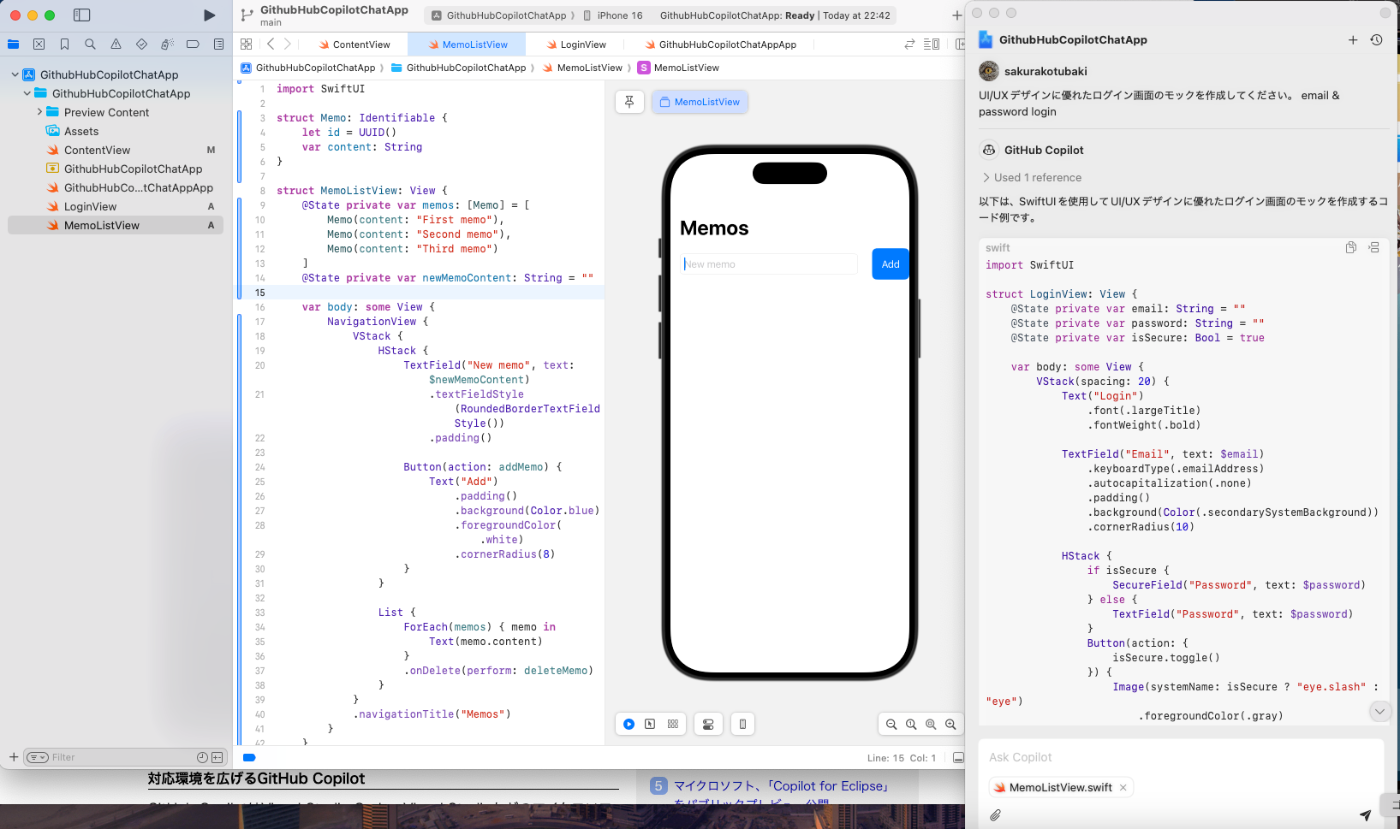 xcodeで、「GitHub Copilot for Xcode Chat」が使えるようになりました🙌