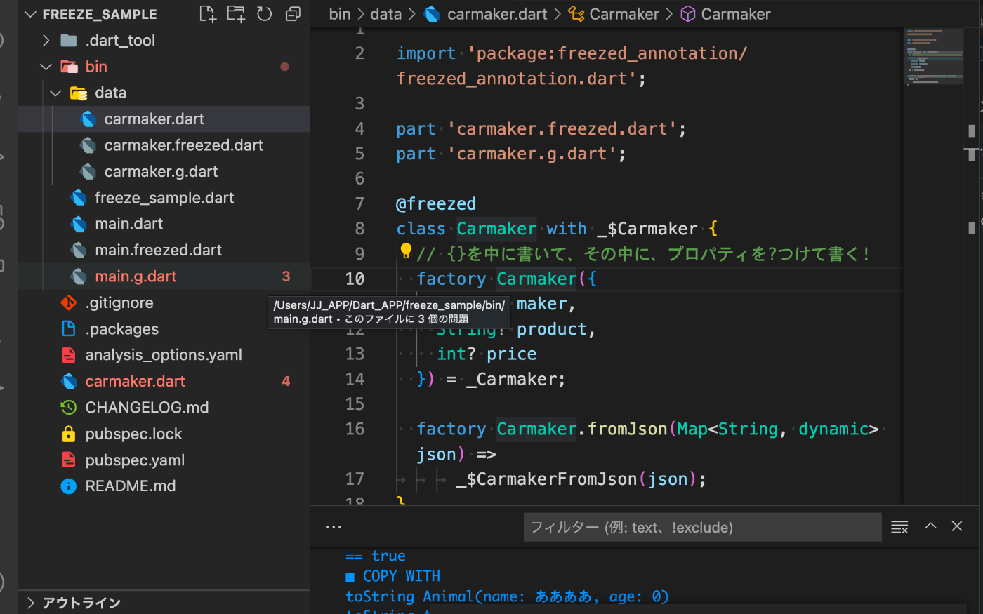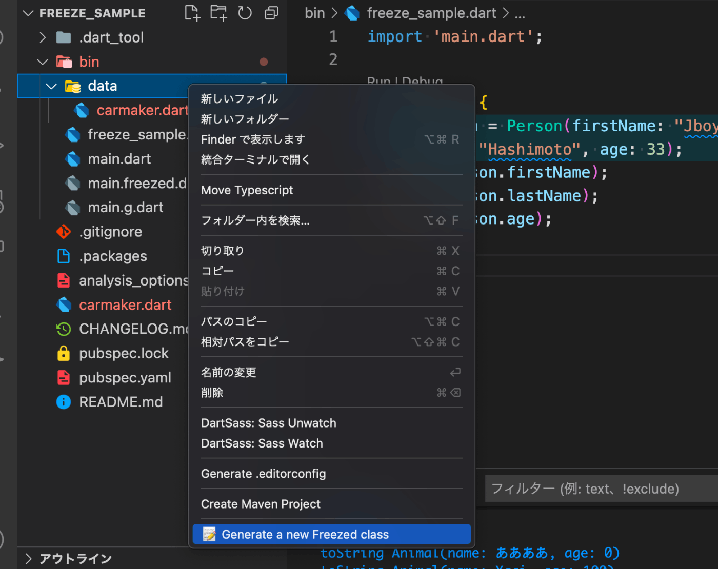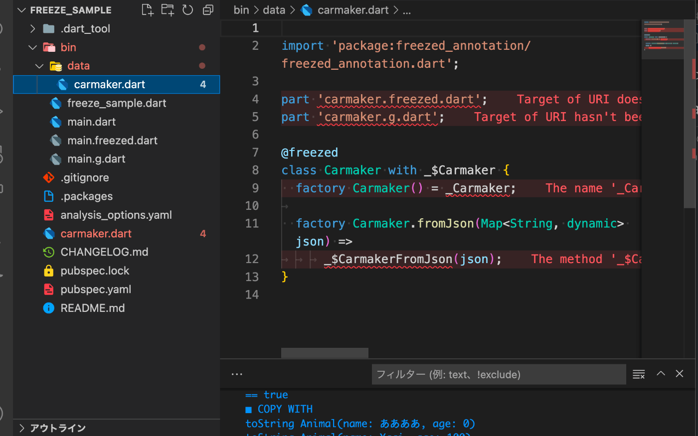 今回はDartファイルを使って、Swiftのplaygrandみたいに、プログラムを動かすだけです。これでfreezedがどうんなものなのかを体験してみます。