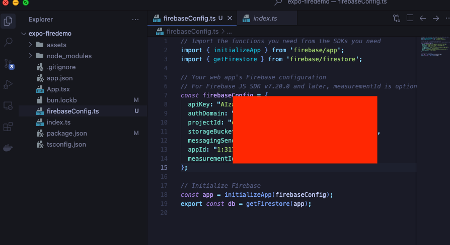firebaseConfig.tsを作成して先ほどコピーしたAPI KEYを貼り付ける。