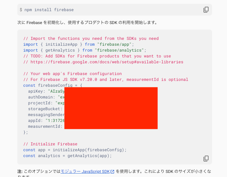 firebaseConfig.tsを作成し、設定を追加