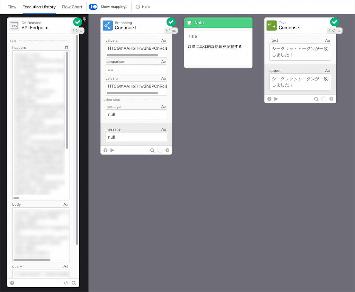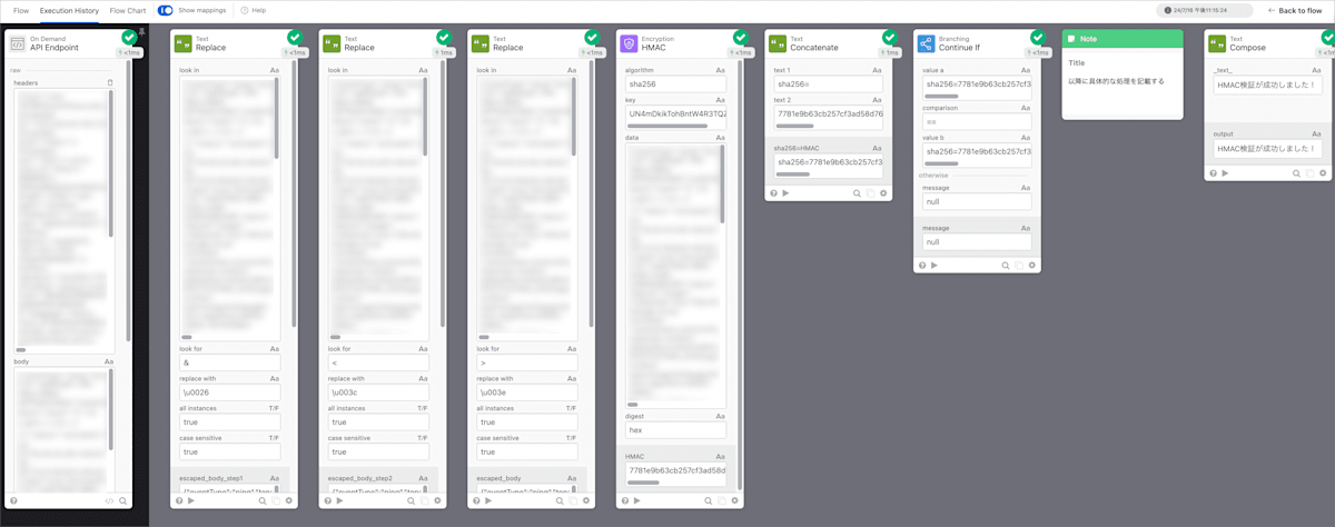 以下ではHMACカードでkeyをkickflow側の設定3. で設定した値とは違う値を入力しているため後続の処理であるComposeカードは実行されていません。