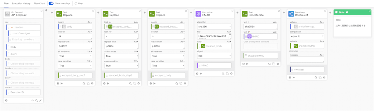 ヘッダーの x-kickflow-signature とHMACで計算され値が一致することで後続の処理であるComposeカードが実行されています。