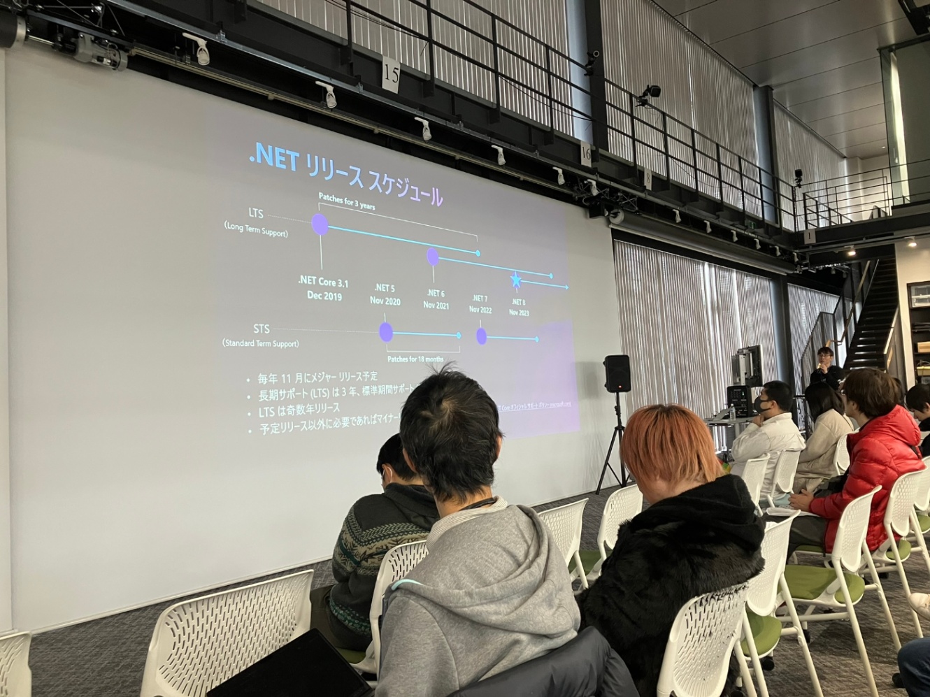 .NETのリリーススケジュールについても説明も(.NET系の技術者はよくわかっていることだと思いますが)あり、.NET6→.NET8と、バージョンが偶数の時にLong Time Support(LTS)として3年間のサポートがされるという話がありました。「3年というのは短く感じるかもしれませんが、現在のシステム開発では様々なオープンソースが関係しているので、脆弱性を排除したりする為には定期的な保守が不可欠」という説明が、確かにそうだなぁと納得でした。「そのためにも自動テストなどを利用して、アップデートにかかるコストを最小化しましょう」というお話もありました。