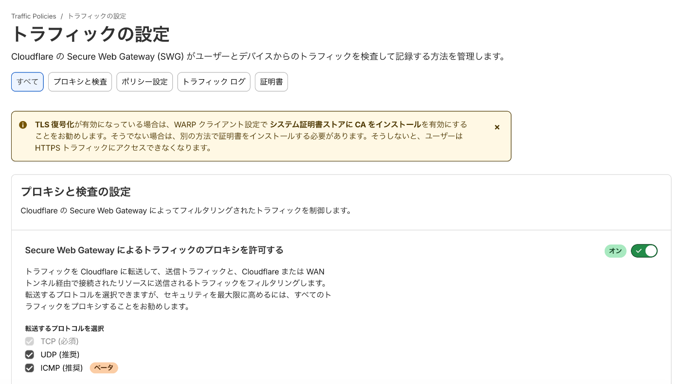 Cloudflare Oneの画面から、トラフィックポリシー -> トラフィックの設定 -> Secure Web Gateway によるトラフィックのプロキシを許可する を有効化した上で、UDPとICMPにチェックボックスをつけておく。