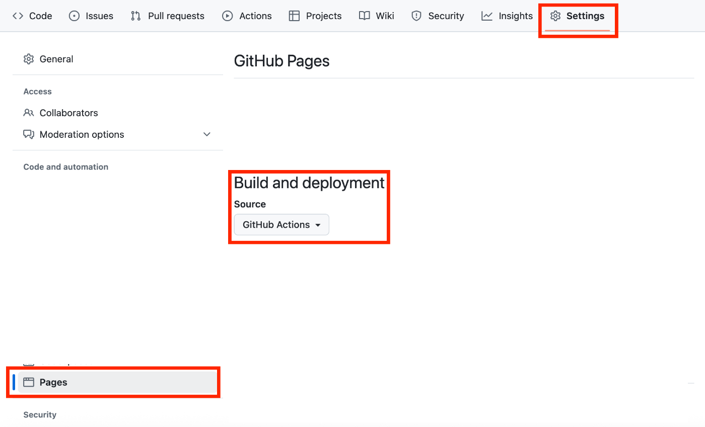 - Build and deployment の Source を GitHub Actions に変更