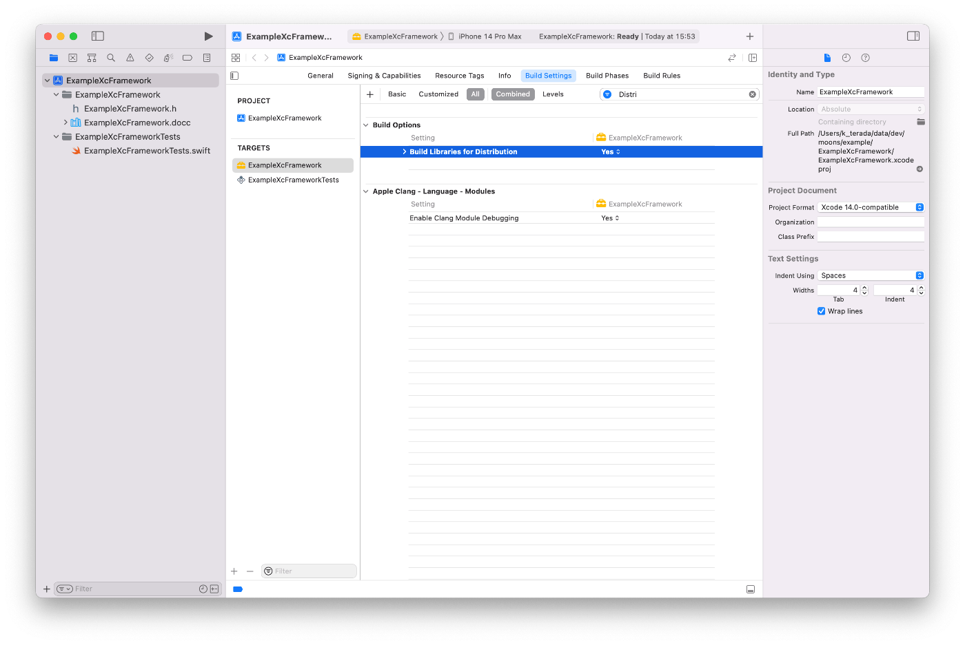 Build Libraries for Distribution という項目がありますので、ここを YESに変更します。