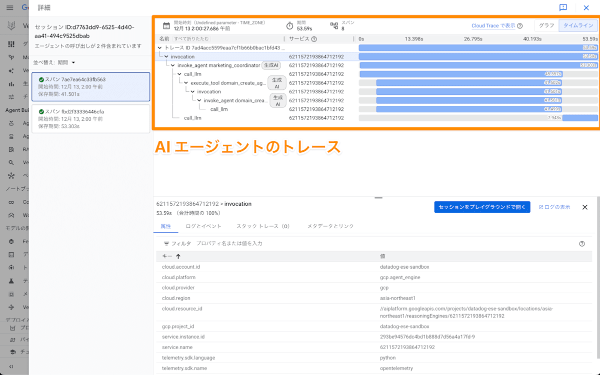 このやり取りで収集されたトレースも Vertex AI Agent Engine 上で Cloud Trace と統合されて可視化されます。